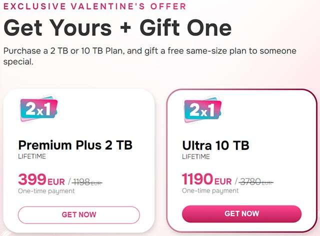 Nei giorni che anticipano la festa degli innamorati, scegliendo un piano Lifetime tra Premium Plus 2 TB e Ultra 10 TB se ne otterrà uno aggiuntivo, senza costi extra, da regalare a chi si desidera. Una sorpresa davvero utile, che potrà essere sfruttata nel tempo per archiviare qualsiasi tipo di documento o contenuto in modo sicuro, attraverso un servizio la cui affidabilità è riconosciuta e certificata, accessibile da qualsiasi dispositivo. Per maggiori informazioni e per tutti i dettagli in merito alle funzionalità incluse rimandiamo alla pagina dedicata.