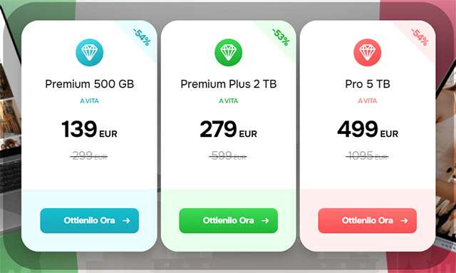 pCloud ha deciso di festeggiare la Festa della Repubblica del 2 giugno proponendo uno sconto del 53%, già attivo, sull’abbonamento a vita al proprio servizio di cloud storage. Scegli la formula che fa per te, tra Premium (500 GB), Premium Plus (2 TB) e Pro (5 TB), approfitta dell’offerta in corso e risparmia oltre la metà della spesa: non dovrai pensarci mai più.