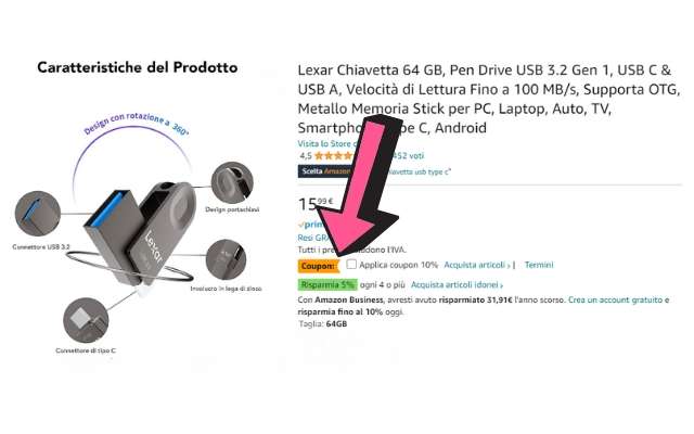 Attiva subito il Coupon 10% Amazon per acquistare la Pen Drive 2 in 1 Lexar 64GB a soli 14,39 euro. Si tratta di un prezzo bomba per questo dispositivo in grado di assolvere a qualsiasi esigenza di archiviazione multidispositivo. Infatti, questa chiavetta è dotata di due connettori: uno USB-A per computer, laptop, smart TV, auto e altro, e una USB-C per MacBook, smartphone e tablet.