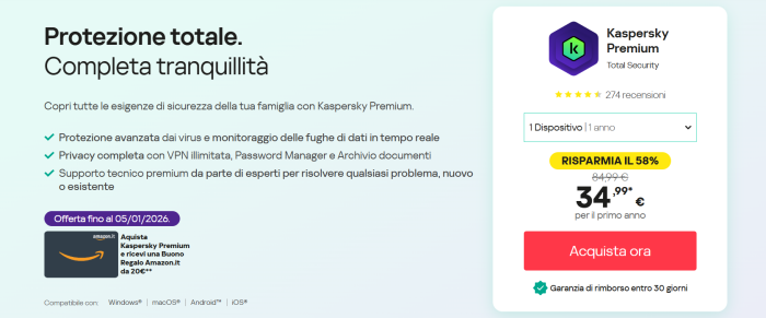 Ricapitoliamo l’offerta: solo per poco tempo, Kaspersky Premium è in sconto del 58% al prezzo di 34,99€ invece di 89,99€. Inclusi ci sono anche un buono Amazon di 20€. Il rinnovo scatta in automatico alla fine del primo anno di utilizzo, ma è possibile disdire in ogni momento. Presente una garanzia di rimborso entro 30 giorni dall’acquisto.