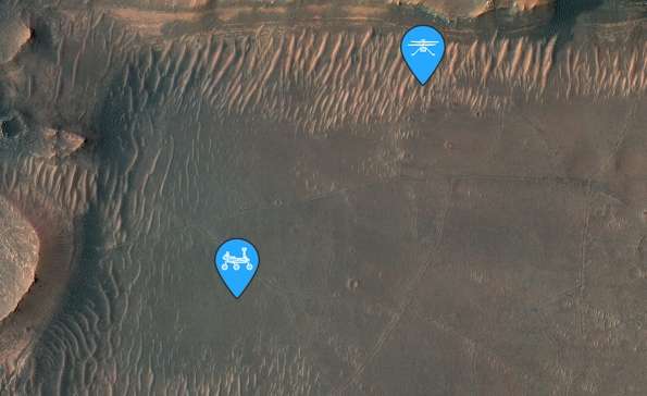 Dopo aver completato il 37esimo volo, Ingenuity è pronto per il 38esimo. L’elicottero percorrerà circa 105 metri in 60 secondi, volando ad una quota massima di 10 metri. Nell’immagine si può vedere l’attuale posizione dei due “compagni di viaggio”: