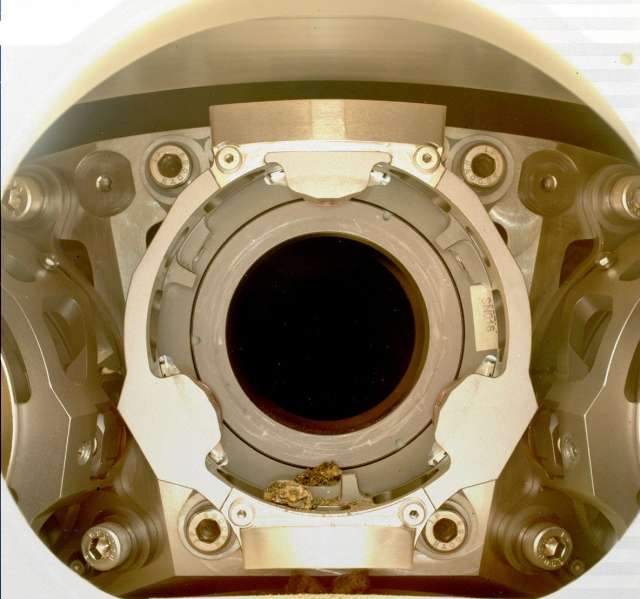 La raccolta del quinto campione di roccia (sesto considerando il primo tentativo fallito) è avvenuta il 29 dicembre 2021, ma la procedura di immagazzinamento del contenitore all’interno del rover è stata interrotta dalla presenza di alcuni detriti all’ingresso del carosello, come si può vedere nell’immagine.