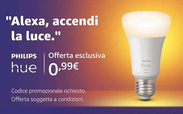 Sicuramente andrà a ruba (in caso di sold out, è in sconto anche TP-Link Tapo L510E). Il consiglio per gli interessati è di non perdere tempo. Ce ne siamo resi conto incrociando questo banner sulla homepage di Amazon. Per approfittarne non bisogna far altro che applicare il codice ALEXAHUE presente nella scheda del prodotto. Attenzione: non tutti sembrano vederlo.