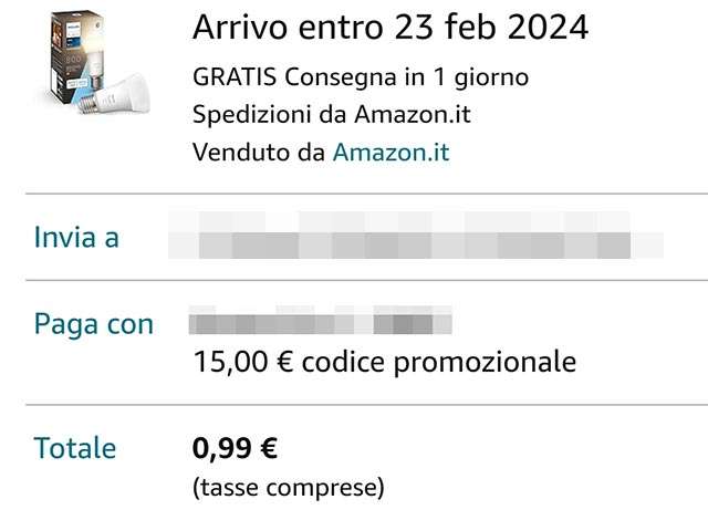 Non sappiamo fino a quando durerà la promozione, né se è accessibile a tutti, ma si tratta di un’offerta talmente ghiotta che vale la pena segnalarla: la lampadina LED della serie Philips Hue con connettività, funzionalità smart, attacco E27 e compatibilità con Alexa è in sconto a soli 0,99 euro su Amazon (il prezzo di listino è 15,99 euro). Eccola nello screenshot dell’ordine.
