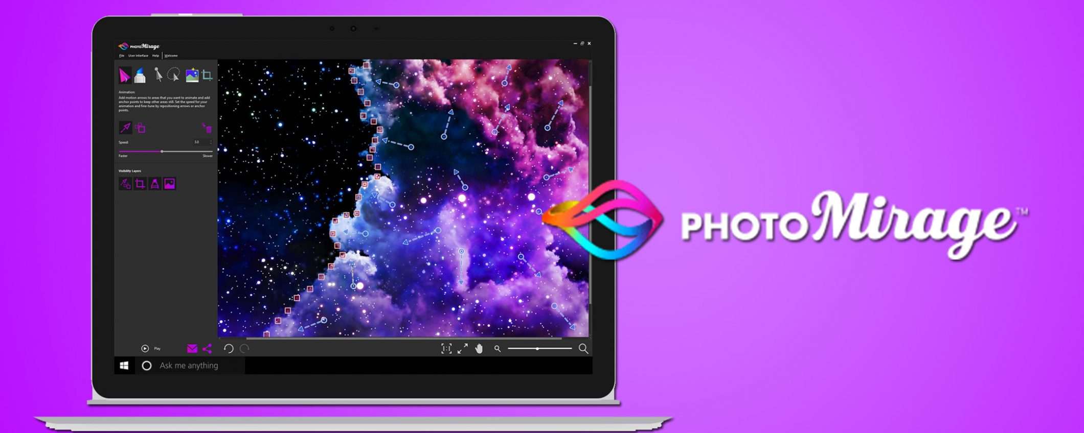 Le funzionalità offerte dal programma sono molteplici. Seleziona, trascina e rilascia le frecce di movimento per spostare l’immagine, traccia punti di ancoraggio attorno alle aree da mantenere ferme e regola la velocità desiderata con un semplice controllo a scorrimento. Poi osserva l’anteprima: la tua immagine prenderà magicamente vita. Questi sono i principi alla base di PhotoMirage. Potrai condividere facilmente le tue opere con gli amici, la tua famiglia o addirittura con il mondo grazie al sistema di condivisione collegato alle principali piattaforme come YouTube, Facebook, Twitter, Pinterest e molte altre. Importa ed esporta il tuo progetto scegliendo fra una moltitudine di formati supportati. Il software supporta, infatti, un’ampia selezione di formati input e output, fra cui Jpeg, PNG, GIF, Mp4, WMV e molti altri.