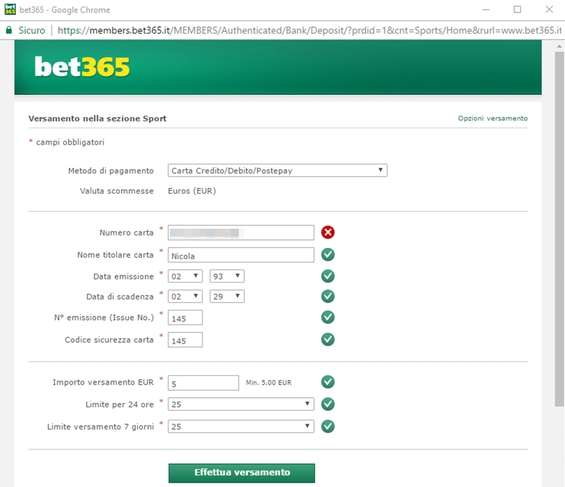 Clicchiamo sul pulsante VERSAMENTI in alto a destra e nel popup successivo indichiamo i dati della carta (nel nostro test abbiamo usato una PostePay) e l’importo del versamento che deve essere di almeno 5 euro. Al termine clicchiamo su EFFETTUA VERSAMENTO in basso.