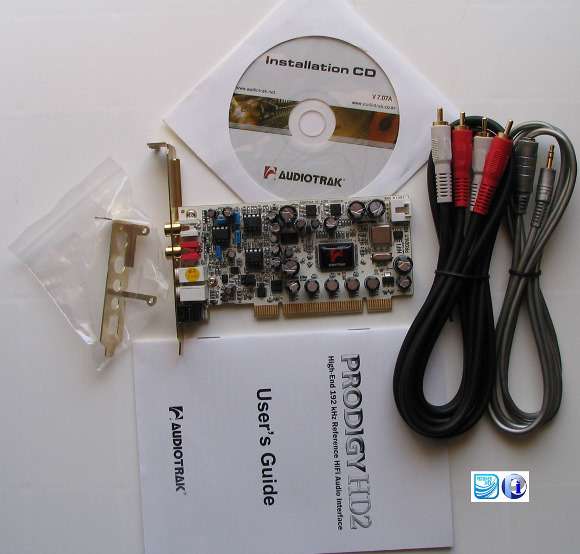 La dotazione prevede, oltre alla Prodigy HD2, il CD dei driver e il manuale, anche una staffa di tipo mini, utile in caso la si installi in un cabinet di tipo XPC o HTPC, una coppia di cavi dotati di attacchi RCA/RCA, per connettere la scheda a un paio di diffusori e un altro cavo di prolunga utilizzabile per il line in o per il line out.