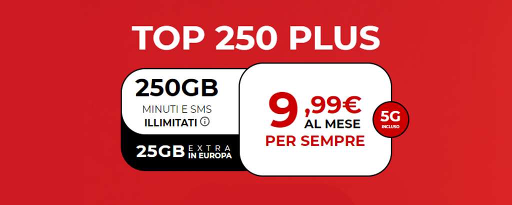 Con TOP 250 PLUS, Iliad propone un’offerta pensata per chi vuole tanti giga, chiamate illimitate, 5G incluso e libertà totale anche fuori dai confini italiani. A 9,99 euro al mese per sempre, è la soluzione perfetta per le tue vacanze: attivala online in pochi minuti, ma affrettati perché l’offerta scadrà a breve!