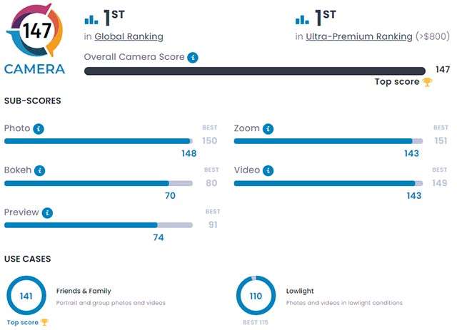 Abbiamo citato in apertura come DXOMARK consideri anche il display per la sua valutazione complessiva. In questo caso, il punteggio si attesta a 146, dietro rispetto ai 149 di iPhone 14 Pro Max. Per quanto riguarda invece la selfie camera, si piazza in terza posizione con 142, a pari punti con HAUWEI Mate 40 Pro. È staccato dai concorrenti iPhone 14 Pro con 145 e da HUAWEI P50 Pro con 144.