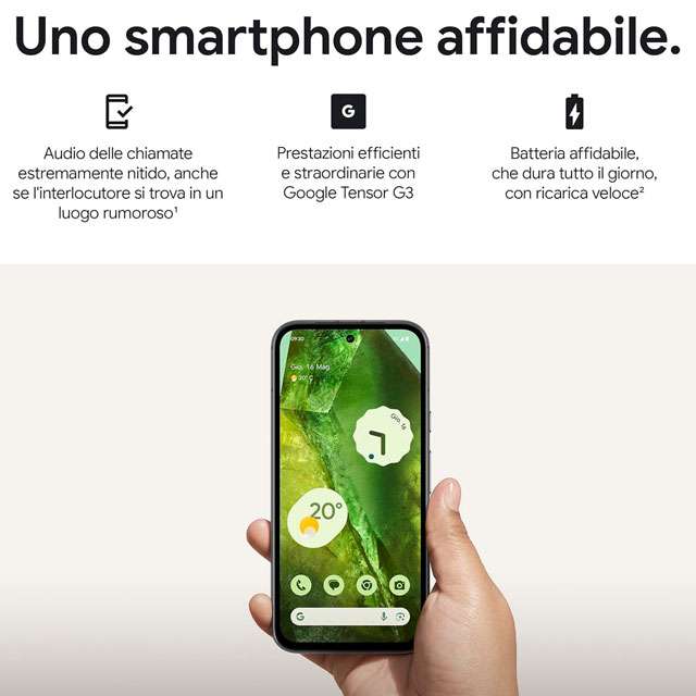 Inoltre, è perfetto se preferisci i dispositivi dalle dimensioni compatte, grazie al suo display Actua da 6,1 pollici in alta risoluzione. Sotto la scocca batte il cuore pulsante rappresentato dal processore Tensor G3 affiancato dal coprocessore di sicurezza Titan M2, da 8 GB di RAM e da 128 GB di memoria interna per l’archiviazione. Sul retro trova posto una doppia fotocamera con sensore principale da 64 megapixel. Ancora, ci sono la connettività Wi-Fi 6E e Bluetooth 5.3, i moduli NFC e GPS, il lettore di impronte digitali e una batteria con autonomia elevata. Scopri di più nella pagina dedicata al telefono.