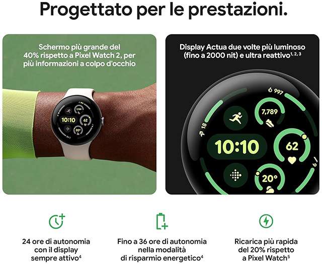 Appena arrivato sul mercato, lanciato solo pochi giorni fa, il nuovo Pixel Watch 3 di Google è già in forte sconto. Su Amazon è infatti spuntata un’offerta con 73 euro di risparmio per la versione LTE, quella dotata di connettività mobile per l’accesso a Internet anche senza doversi portare dietro lo smartphone. Non sappiamo fino a quando rimarrà attiva la promozione: se sei interessato, il consiglio è di metterlo subito al polso per non perdere l’occasione.