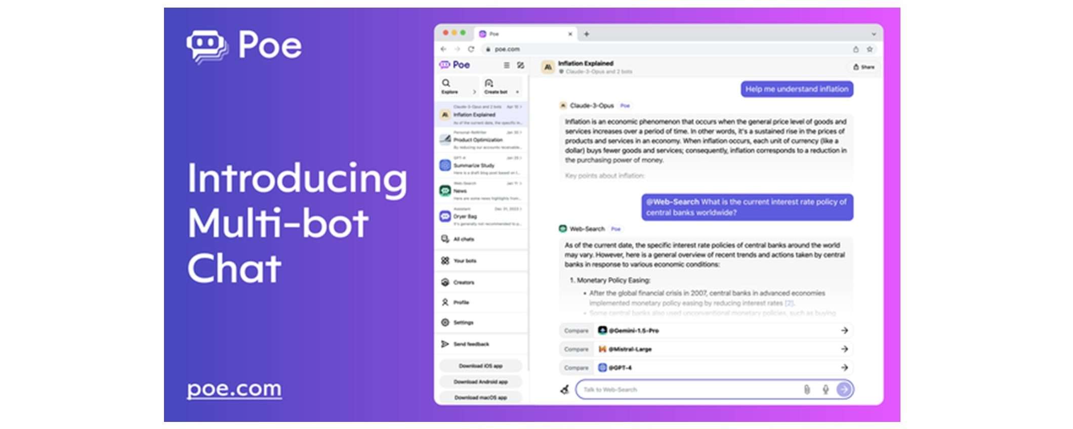 Una delle novità più interessanti, è la sua “chat multi-bot“. Questa funzione consente agli utenti di interagire con molteplici modelli di AI contemporaneamente, all’interno di un singolo thread di conversazione. Che si tratti di utilizzare GPT-4 per analisi approfondite, Claude per la scrittura creativa o DALL-E 3 per la generazione di immagini, la piattaforma offre un’esperienza fluida e integrata. Grazie a raccomandazioni contestuali e alla possibilità di menzionare i bot con un semplice @, Poe semplifica la ricerca della combinazione ottimale del chatbot AI per soddisfare le diverse esigenze degli utenti.