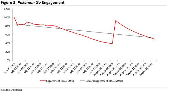 Il declino parrebbe essere già iniziato, ma quanto durerà? Difficile stimarlo. Più difficile comunque che il gioco perda tutta la sua pletora di giocatori. Axiom Capital Management stima che da metà luglio l’app abbia perso circa 15 milioni di utenti. Si tenga conto che il numero di utenti attivi giornalmente su Pokémon Go ha toccato il picco intorno ai 45 milioni il 16 luglio per poi scendere a 30 circa solo un mese dopo, il 17 agosto. Ma non è il solo dato calante: sempre secondo i calcoli elaborati da Axiom, in declino sarebbero anche il numero dei download, l’engagement e il tempo medio trascorso sull’app. La curiosità è che tutto questo sarebbe avvenuto proprio mentre l’app si espandeva, cioè sbarcava in tanti altri paesi/mercati – anche molto popolosi – come il Brasile, l’Indonesia, le Filippine, la Francia ecc.