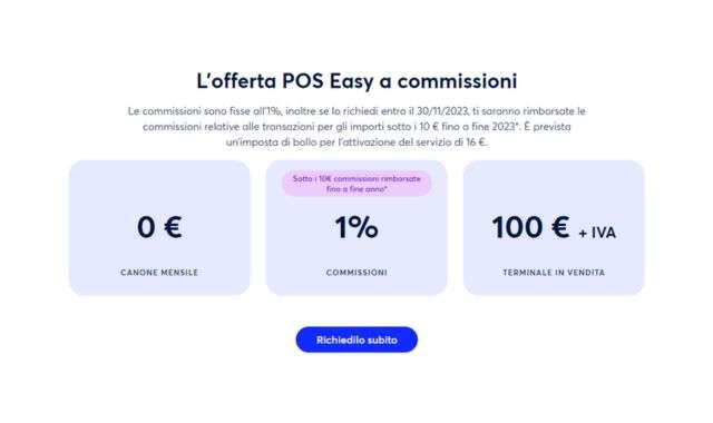 - Rimborso sulle Commissioni per Importi sotto i 10 €: Questa è la parte davvero speciale. Se attivi POS Easy entro il 30 novembre 2023, ti verranno rimborsate le commissioni relative alle transazioni per gli importi sotto i 10 € fino a fine 2023. In pratica, pagherai zero commissioni su queste transazioni per il resto dell’anno.
