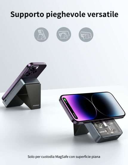 La tecnologia MagSafe è una rivoluzione e se da tempo ti stai domandando come sfruttarla al meglio la risposta è con un Power Bank Magnetico. Questo gioiellino ha due funzioni al suo interno: ti regala due ricariche ma anche uno stand.
