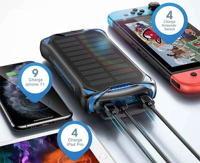 Oltre ad assorbire la luce del sole e incamerare un grande quantitativo di energia offre una serie di funzionalità non comuni. Una potente torcia con 12 LED anzitutto, utile per illuminare qualsiasi ambiente anche in caso di blackout improvvisi. C’è poi il supporto alla ricarica wireless Qi, così da poter eseguire l’operazione senza cavi. Completano l’elenco tre ingressi e due uscite, tra i quali spicca una porta USB-C che funziona sia in ingresso sia in uscita. Non manca poi il supporto a Lightning e micro-USB. Tutti gli altri dettagli nella descrizione completa.