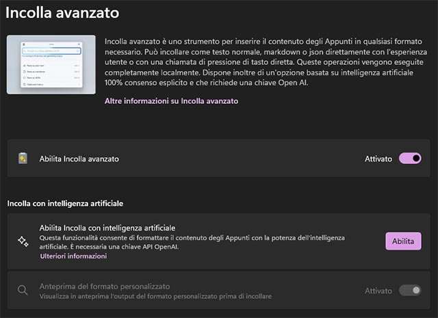 - Incolla avanzato ha una nuova funzionalità chiamata Incolla avanzato con intelligenza artificiale che utilizza Semantic Kernel per intervenire sugli appunti;