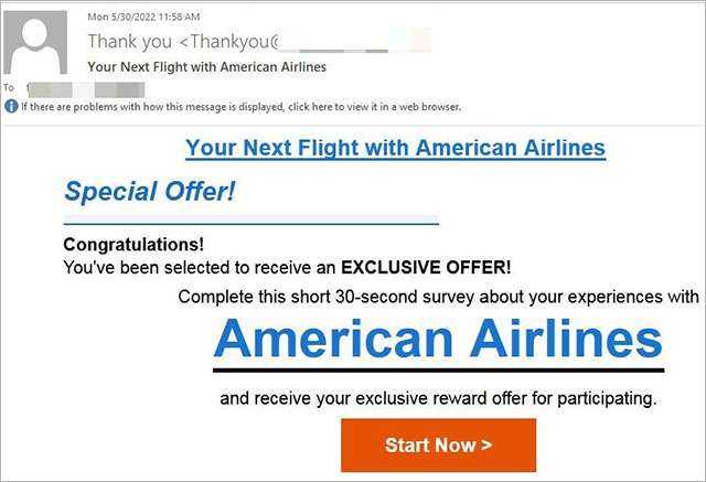Le modalità impiegate sono differenti. In alcuni casi si ricevono email con proposte particolarmente vantaggiose sui biglietti aerei, come nel caso dello screenshot qui sotto, simulando l’invio da parte di alcune delle compagnie più note. In altri, viene fatta pressione per l’invio urgente di dati o per il download di file infetti. Per quanto riguarda i messaggi di posta elettronica truffaldini, i titoli contengono solitamente riferimenti a “Ore di volo bonus”, “Affitti di vacanze e offerte all-inclusive”, “Avvisi di ricezione della prenotazione”, “Conferme di prenotazione” oppure “Omaggi di biglietti aerei”.