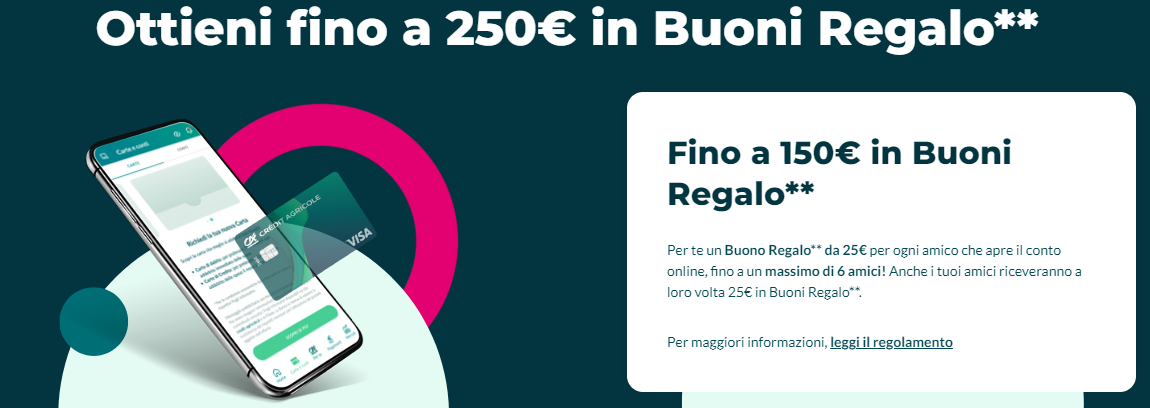 Aspetta, perché c’è dell’altro. Per ogni amico che inviti ad aprire il conto, otterrai un buono di 25 euro. Siccome puoi invitare massimo 6 amici, se ci riesci arriverai a 150 euro complessivi. Anche i tuoi amici, ovviamente, avranno i loro buoni.