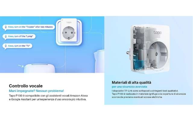 Ma cosa ha di eccezionale questa presa intelligente? Primo, è facile da installare. Collegala a una comunissima presa di corrente, attivala tramite l’app Tapo, collegala al tuo WiFi di casa e connetti qualsiasi dispositivo. In questo modo potrai gestirlo da remoto, accendendolo e spegnendolo tramite app o comandi vocali. Infatti, Tapo P100 è compatibile con Alexa e Google Home.