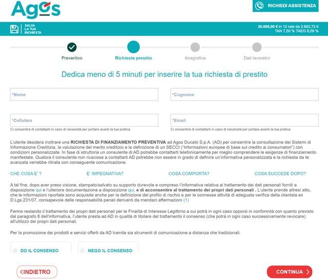 Puoi richiedere un prestito online con Agos su questa pagina. Dall’approvazione trascorrono sole 48 ore per ricevere il prestito.