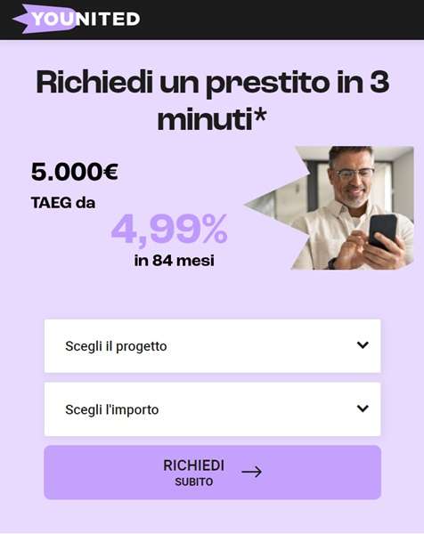 Riceverai una prima risposta subito dopo. In seguito, per ottenere il responso definitivo riguardo alla richiesta di prestito, dovrai attendere non più di 24 ore. Ti ricordiamo infine che puoi richiedere il prestito personale online con Younited in meno di 3 minuti tramite la pagina dedicata, con la possibilità di ottenere un preventivo gratuito e senza impegno.