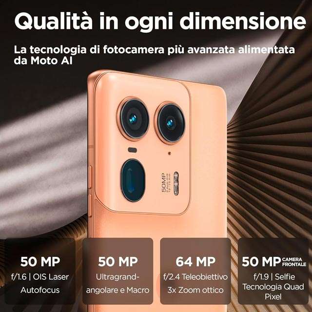 Oggi, lo smartphone top di gamma Motorola Edge 50 Ultra è in sconto di ben 227 euro e lo puoi acquistare al prezzo crollato di 772 euro (invece di 999 euro come da listino). La colorazione è Peach Fuzz, quella visibile in queste immagini. C’è anche quella Forest Grey a 780 euro. Entrambe sono realizzate con materiale premium vegano.