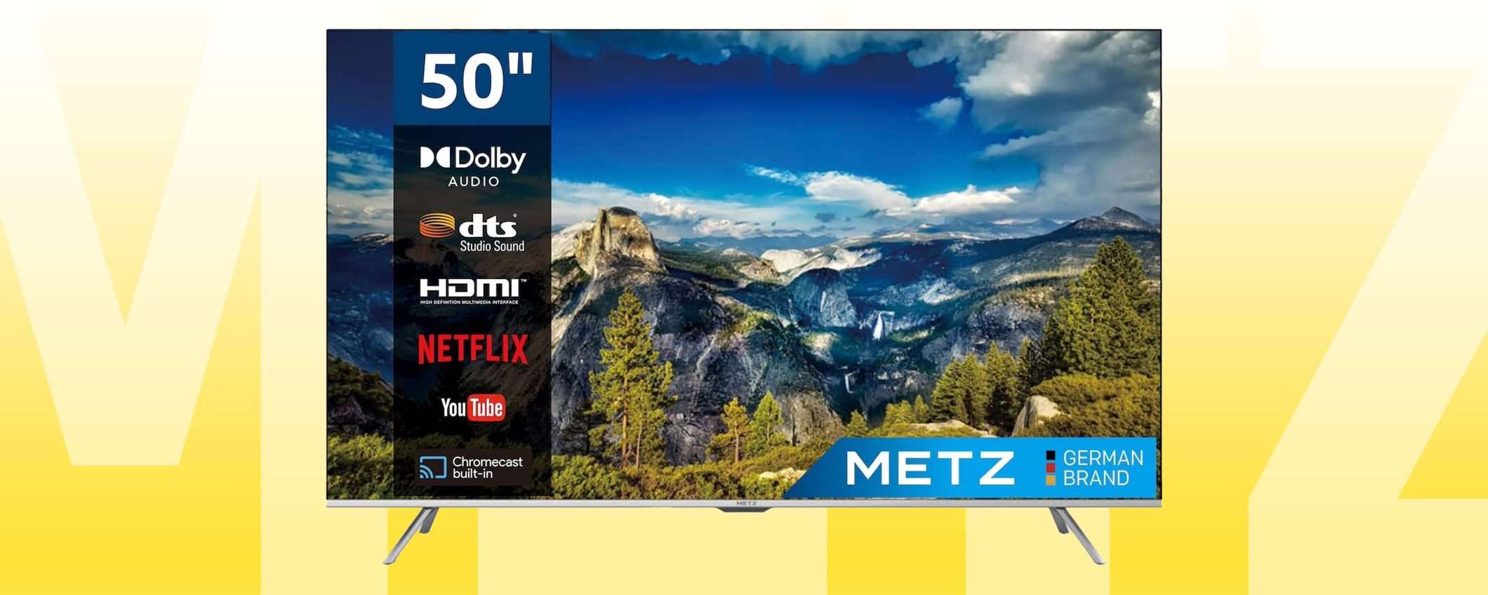 Vale la pena segnalare l’offerta di Amazon che oggi propone la Smart TV 4K della linea METZ MUC7000, nella sua versione da 50 pollici, al prezzo minimo storico. Progettata dal marchio tedesco con alle spalle oltre 80 anni di esperienza nel settore, ha tutto ciò che serve per l’intrattenimento in salotto.
