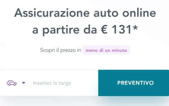 Inserendo il numero di targa direttamente nel campo dedicato presente nella pagina web, puoi scoprire il prezzo della tua assicurazione in meno di un minuto: costi a partire da soli 131 euro! Cogli subito l’occasione!