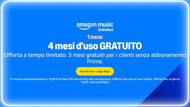- I clienti Prime che non hanno ancora provato Amazon Music Unlimited potranno usufruire di quattro mesi di uso gratuito. Poi, i clienti individuali che si iscrivono ad Amazon Music Unlimited potranno passare ad un piano famiglia senza costi aggiuntivi per due mesi. Maggiori informazioni disponibili su amazon.it/music/unlimited.