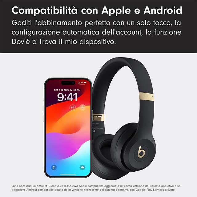 Lo sconto di 107 euro sul listino porta le cuffie wireless Beats Solo 4 al loro prezzo minimo storico di 122 euro. La colorazione è Nero e oro, visibile in queste immagini. Come già segnalato in apertura si tratta di un’offerta lampo che andrà inevitabilmente sold out a breve, la richiesta è molto elevata. Non c’è bisogno di applicare coupon.