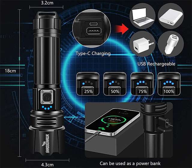 Non è solo una torcia LED professionale da 10.000 lumen, ma anche un dispositivo versatile, in grado di svolgere all’occorrenza il ruolo di powerbank per la ricarica dei dispositivi: questo modello del marchio Shadowhawk, il più venduto della categoria su Amazon, è proposto oggi in sconto al prezzo di soli 23 euro (il minimo storico) in occasione del Prime Day.