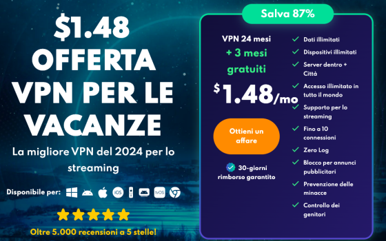 Se stai cercando una soluzione affidabile per proteggere la tua privacy online e accedere a contenuti in streaming senza limitazioni, L’offerta di PrivadoVPN è quello che fa per te. PrivadoVPN è ora disponibile a un prezzo incredibile di soli €1.48 al mese, con uno sconto del 87% per 24 mesi di protezione + 3 mesi gratuiti.