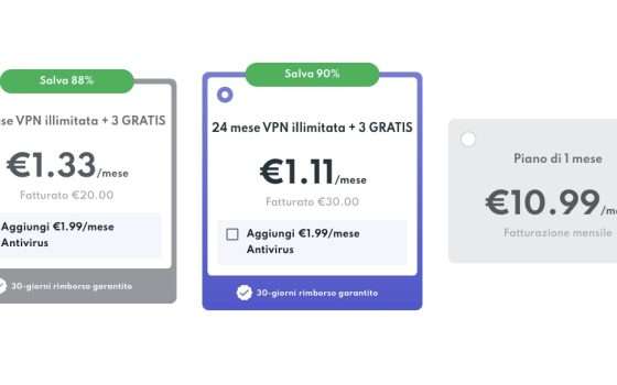 L’offerta più conveniente è il piano VPN illimitata per 24 mesi, che include anche 3 mesi gratuiti. Con questa promozione il prezzo scende a circa 1,11 euro al mese, con un pagamento iniziale di 30 euro per il periodo completo.