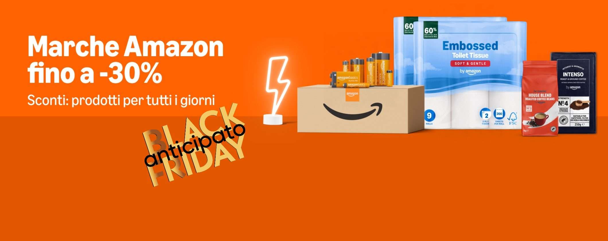Scopri tantissimi prodotti firmati Amazon in offerta speciale fino al 30% di sconto! Fai subito l’affare prima che finiscano. Approfitta adesso del Black Friday Anticipato!