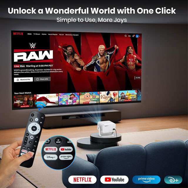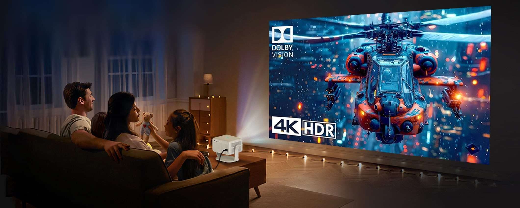 Tra le caratteristiche più interessanti ci sono il supporto rotante a 360 gradi per sfruttare pareti e soffitti da qualsiasi angolazione, l’autofocus, la correzione automatica della distorsione trapezoidale, senza dimenticare la licenza ufficiale Netflix per accedere senza difficoltà a tutti i contenuti della piattaforma. Tra le altre applicazioni supportate ci sono Prime Video, YouTube e Disney+. Non vanno poi dimenticati il contrasto 20.000:1, la luminosità elevata, gli altoparlanti stereo integrati con audio 3D, la connettività Wi-Fi e Bluetooth e le tante porte di collegamento per fonti e periferiche esterne. Trovi tutte le altre informazioni che cerchi nella scheda del dispositivo.