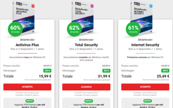 Se invece cerchi una protezione completa per i dispositivi di casa, puoi affidarti a Bitdefender Total Security. A differenza degli altri piani, potrai proteggere fino a 5 dispositivi (Windows, macOS e Android e iOS) e ottimizzare il tuo device per prestazioni sempre al top. Puoi acquistare l’abbonamento annuale al prezzo di 31,99 euro (con uno sconto del 62% rispetto al prezzo iniziale). Un’ultima opzione, è Bitdefender Premium Security, che offre VPN illimitata, password manager e protezione per 10 dispositivi. Puoi acquistarlo al prezzo di 49 euro (per il primo anno), anziché 139 euro. Infine, se hai bisogno solo di una VPN illimitata o di un password manager sicuro, puoi acquistarli a parte al rispettivo prezzo di di 29,99 euro e 19,98 euro per il primo anno.