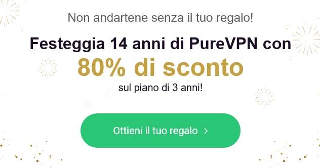 Ottima offerta da prendere al volo per la nota PureVPN. La software house festeggia 14 anni dalla fondazione e per l’occasione propone uno sconto imperdibile dell’80% sull’abbonamento per tre anni. Gli utenti pagheranno solo 69,12 euro corrispondenti a 1,92 euro/mese.