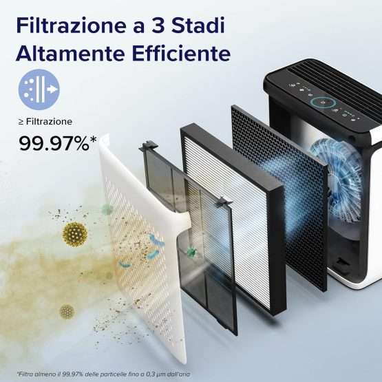 Tutto il merito, infine, va al filtro HEPA che è in grado di catturare la particelle più piccole e bloccarle per rimettere in circolo sono aria pulita e sana. In modo particolare ha un grado di successo pari al 99,97% ed è ideale per allergeni come pollini, polvere, peli di animali ma anche cattivi odori e così via.