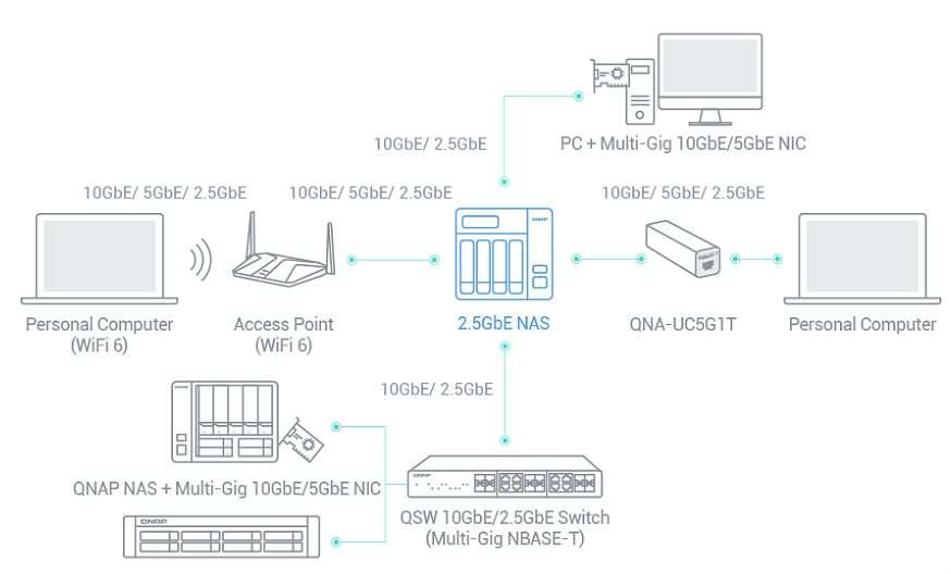TS-464 supporta la connettività 2,5 GbE: grazie alle due porte integrate, il NAS è in grado di raggiungere velocità di trasferimento fino a 589 MB/s in lettura e scrittura, avvicinandosi alle prestazioni di sistemi 10 GbE a singola porta.