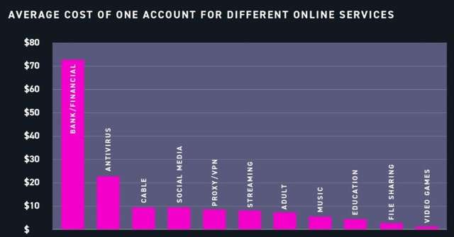 Un account bancario può arrivare per contro ad una media di 70,91 dollari. Si tratta di una cifra che corrisponde alla magnitudo del danno perpetrabile: il costo è maggiore poiché maggiore è il denaro ricavabile. Secondo ai dati bancari vi sono soltanto i dati relativi ad account di antivirus, che arrivano fino a poco oltre i 20 dollari cadauno: considerando quanto azioni di rastrellamento di informazioni possono spesso essere massive, è chiaro come il tutto si traduca facilmente in malaffari da milioni di dollari.