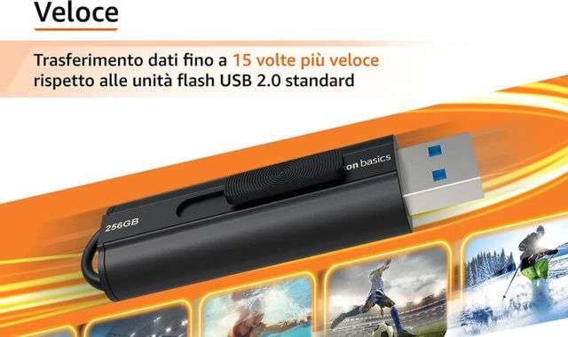 Si tratta di una pen drive USB 3.1 da 256GB del marchio Amazon Basics e che oggi puoi acquistare in sconto a soli 21,56 euro: grazie alla spedizione Prime potrai riceverla a casa subito.