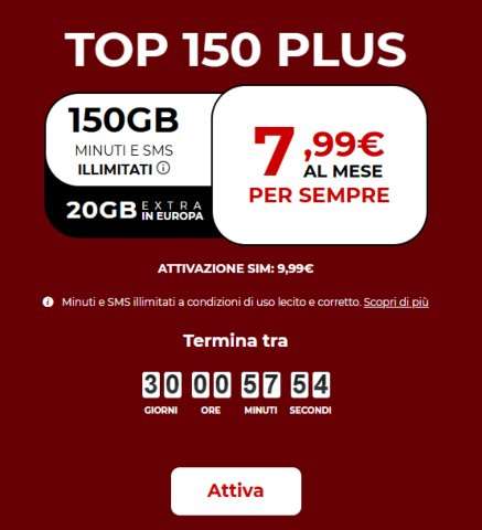 L’offerta mette a tua disposizione 150GB da utilizzare in 4G o 4G+, con minuti e SMS illimitati verso fissi e mobili in Italia e in Europa. Inoltre, si aggiungono 20GB dedicati per il roaming europeo, quindi se stai programmando un viaggio avrai anche internet per continuare a navigare sui social e farti sentire con amici e parenti a casa.