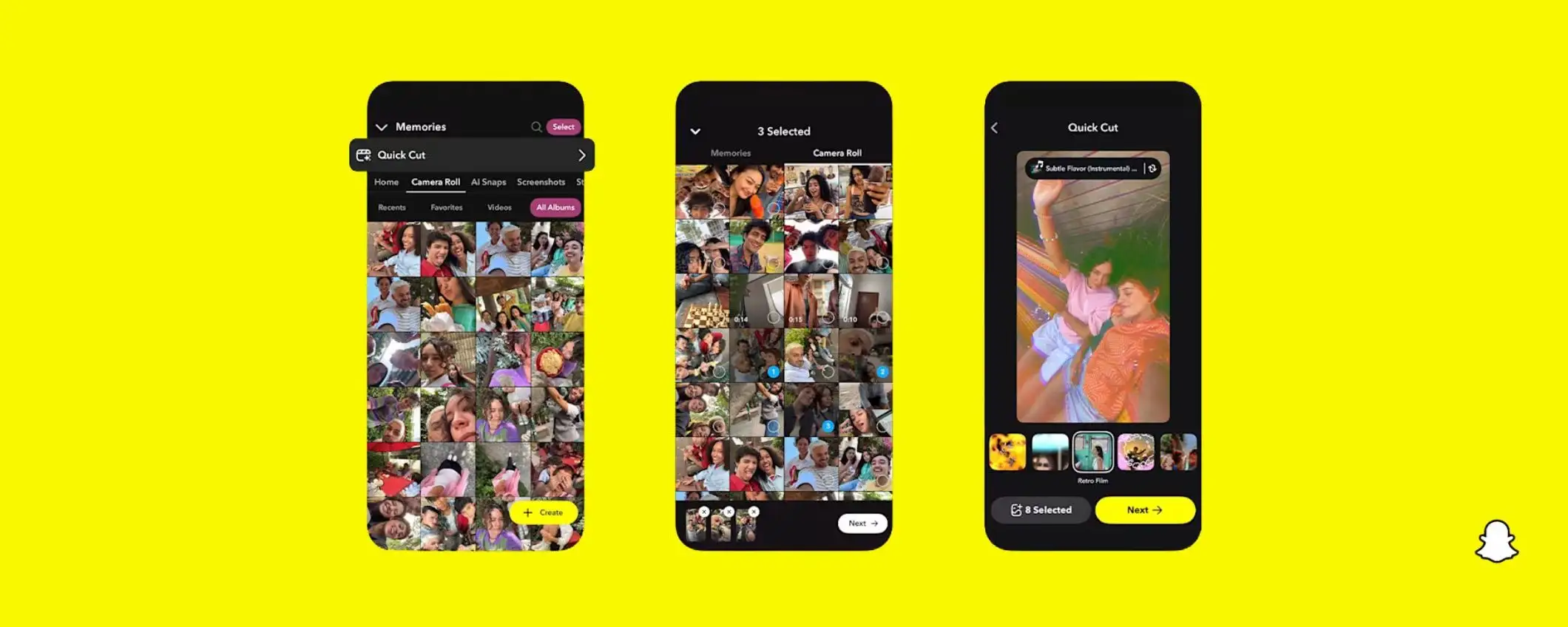 Quick Cut è integrato direttamente in Snapchat e accessibile da più punti dell’app, inclusi Memorie e la galleria fotografica. Si selezionano le foto o le clip, l’algoritmo fa la magia, e nel giro di pochi secondi si ottiene un’anteprima del video renderizzato.