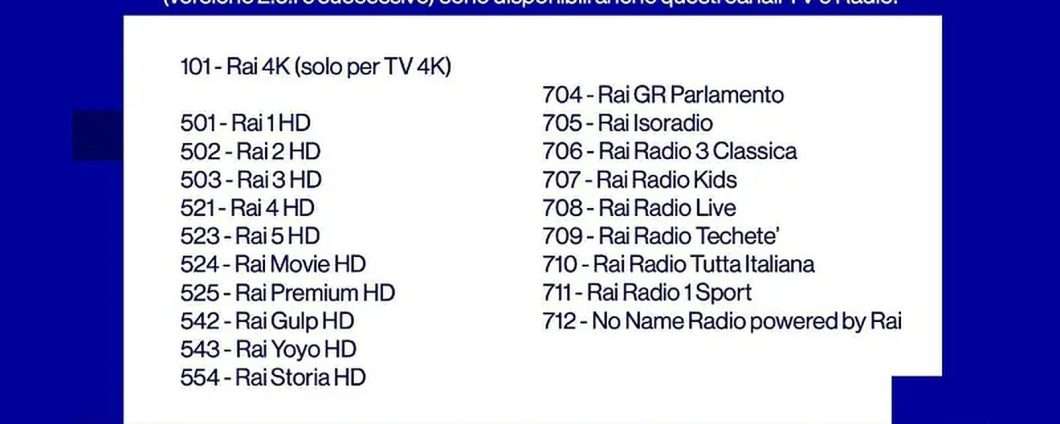 Al contempo, si segnala la disponibilità di canali radiofonici in TV dal numero 704 al numero 712 del digitale terrestre, mentre al numero 101 si trova Rai 4K per televisori dotati di pannello Ultra HD.
