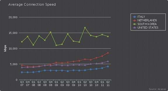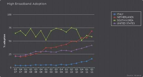 E l’Italia? Il Belpaese telematico è in crescita ma il confronto con le nazioni sviluppate è come sempre avvilente. Basti dare un’occhiata ai grafici: la penetrazione della banda larga (5Mbps) veleggia abbondantemente al di sotto del 25 per cento, mentre la velocità media delle connessioni intercettate da Akamai ai 5 Megabit nemmeno ci arriva. Peggio degli USA, molto, molto peggio di Olanda e dell’inarrivabile Corea del Sud.