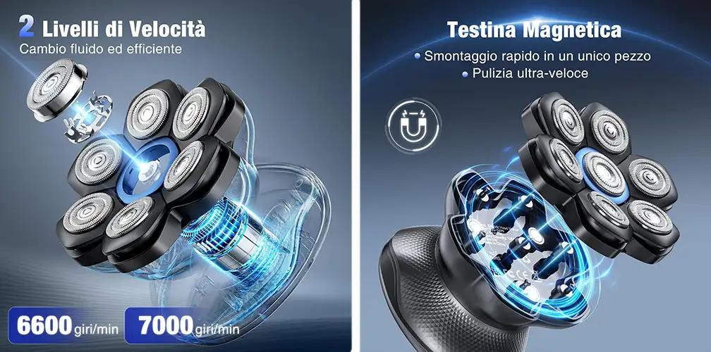 Interessante anche la presenza di due velocità, con funzionamento indicato a 6600/7000 RPM. Questa doppia impostazione consente di adattare il comportamento del rasoio alle diverse esigenze. Chi preferisce un passaggio più delicato può orientarsi sulla modalità più morbida, mentre chi desidera una rasatura più rapida e incisiva può sfruttare la velocità superiore. È una caratteristica che aggiunge versatilità a un prodotto già pensato per semplificare la gestione quotidiana della rasatura, soprattutto per chi alterna testa, collo, contorni e rifiniture più frequenti.