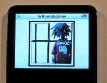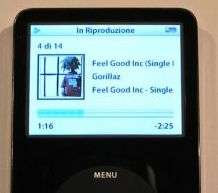 | Premendo il pulsante centrale accediamo, in sequenza, al tempo trascorso, l’immagine di copertina (che in questa foto evidenzia nuovamente la qualità del display), il voto e il testo della canzone (se sincronizzato da iTunes). |