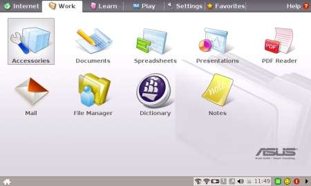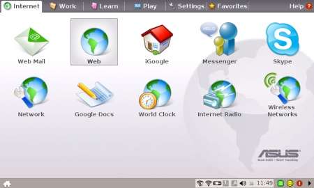 La prima scheda è Internet , e contiene Web mail (una cartella con link a Gmail, Hotmail, Yahoo! Mail e AOL Mail), Web (il bowser Firefox), iGoogle (un link al portale servizi di Google), Messenger (il client IM Pidgin), Skype, Network (il tool per creare, gestire e configurare le connessioni di rete), Google Docs (link alla suite per l’ufficio online di Google), World clock (che mostra fusi orari e zona diurna/notturna), Internet Radio (link al portale di radio su Internet mediayou.net ), e Wireless Network (per la connessione alle reti wireless rilevate).