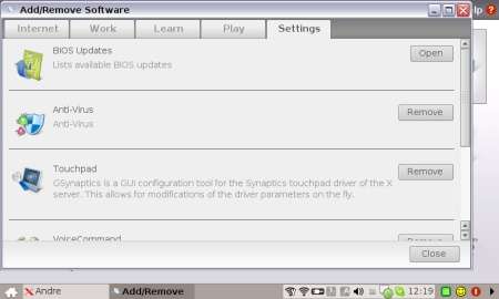 Uno degli strumenti più importanti di Settings è Add/Remove Software , che a dispetto del nome serve esclusivamente per aggiornare il sistema via Internet, utilizzando i repository ufficiali di Asus. Sull’EeePC da noi testato il sistema ha proposto nuove versioni di Skype, del dizionario, del driver per il touchpad, della funzionalità VoiceCommand e dell’antivirus. Ma gli update più importanti sono quelli relativi al BIOS : nel nostro caso quello di fabbrica era lo 0204, aggiornabile con lo 0401 o il più recente 0703, datato 9 gennaio 2008. Come si è detto in precedenza, circolano anche BIOS non ufficiali che permettono di incrementare la luminosità dello schermo e, cosa più importante, di portare il processore alla sua frequenza di lavoro nominale, pari a 900 MHz.